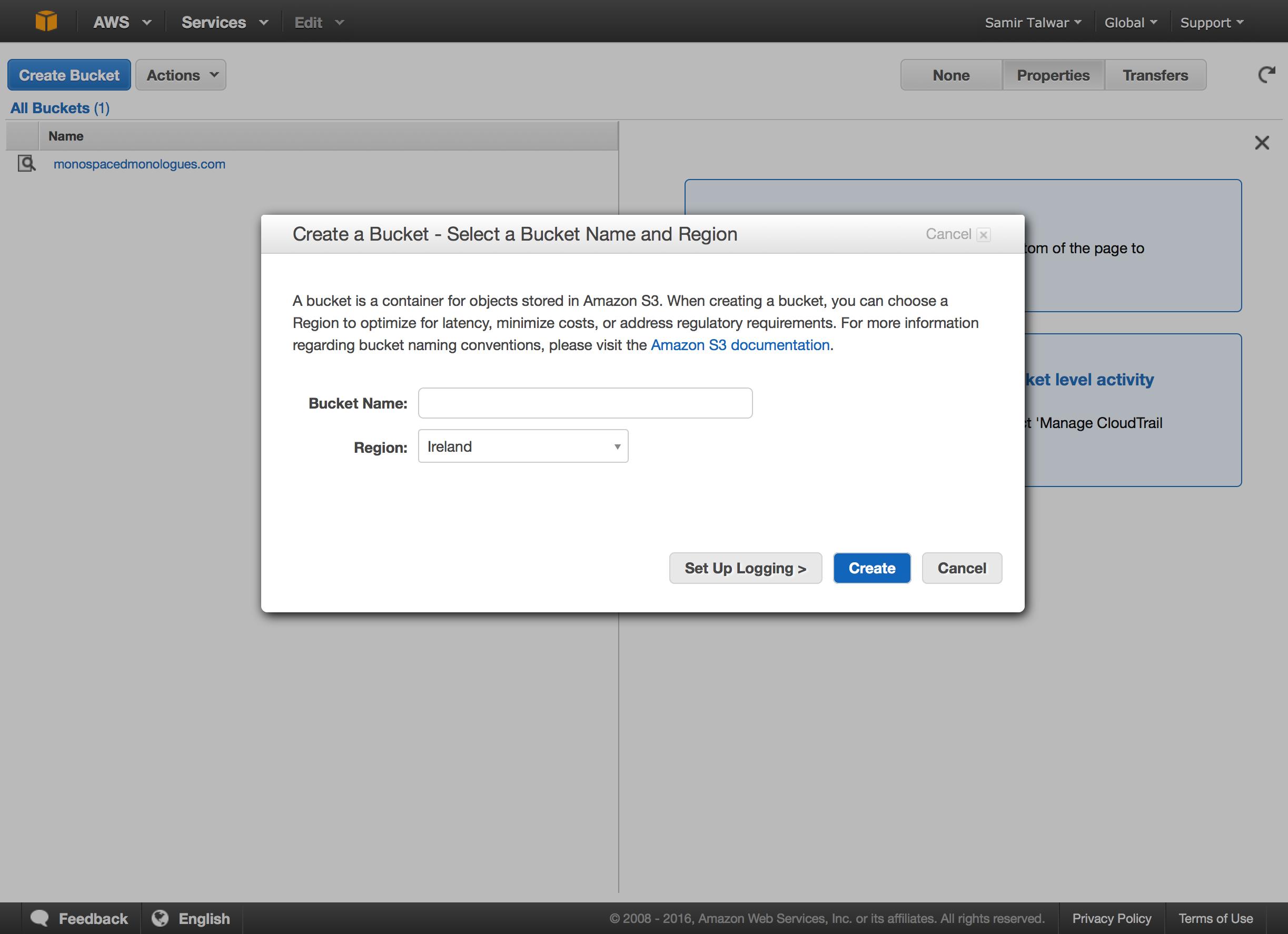 Once we're on the S3 home page, create your bucket. If you have a domain name already, I'd recommend naming it the same as your domain — it'll stop you getting confused later if you end up with multiple buckets for multiple purposes. I named mine "monospacedmonologues.com". Your bucket name needs to be globally unique, so if you don't own a domain name, you may have to be fairly inventive.