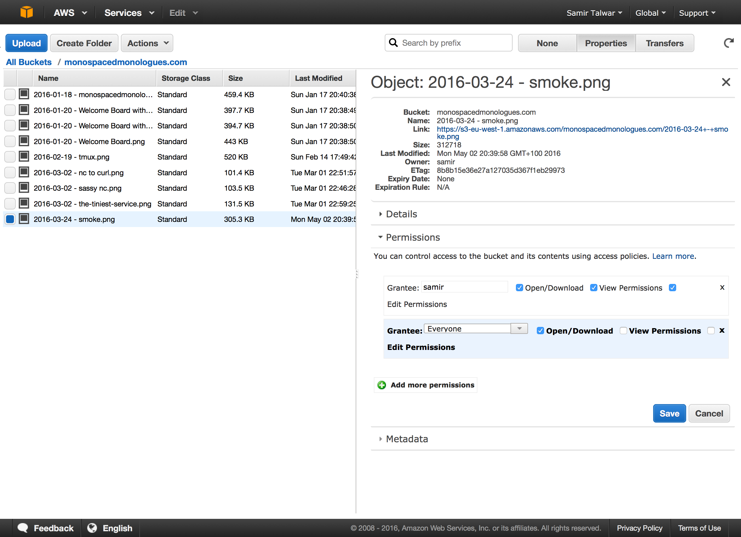I get about a thousand visitors to my blog per month. There's not a lot of people viewing the images as I don't use them very often, but even if it were to become a lot popular, I'd still probably fit into S3's free tier and pay nothing at all for storage. After the first 20,000 requests, the Ireland region charges $0.03 (USD) per GB, which means if I become a celebrity and millions of people read my blog, I'll probably be charged $1 per month.