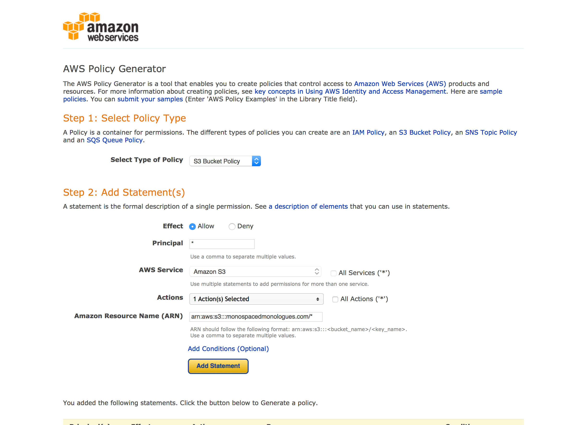 Of course, this could get tedious if we have more than a few files. An alternative is to specify a policy for the bucket. These are quite complicated, but we can do it by using the AWS Policy Generator.