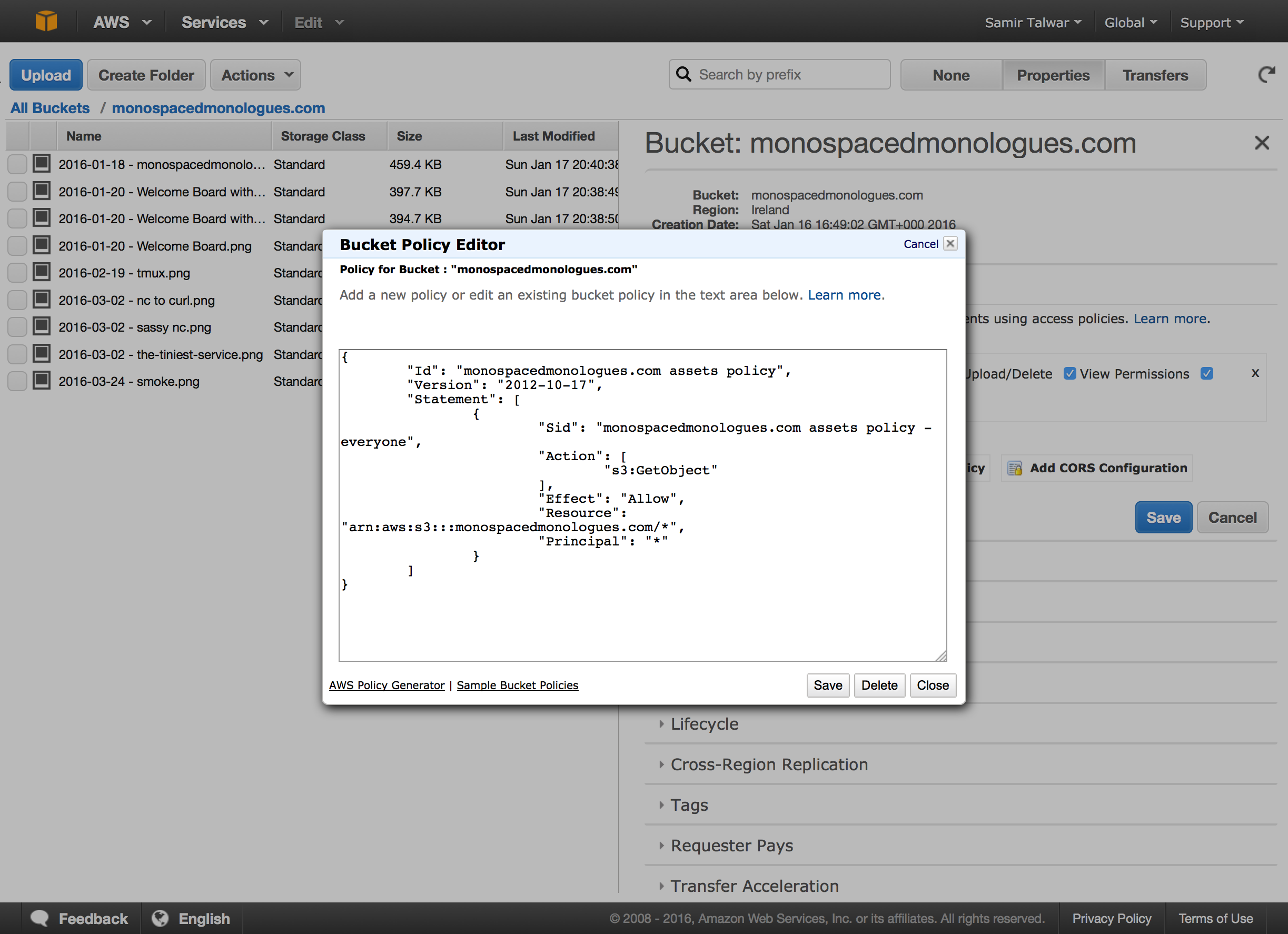Copy the code you see in the policy generator and Head back to S3. Deselect all files and open the Properties view to check out the bucket's properties. Open up the Permissions section, click Add bucket policy and paste in the policy you generated, then save.