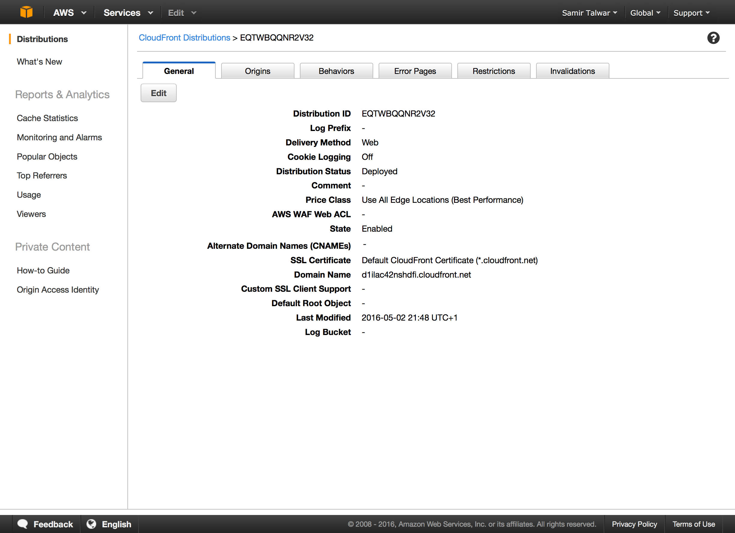 Next, you may have noticed that your CloudFront distribution had an empty field named Alternate Domain Names (CNAMEs). Edit the distribution by clicking the Edit button, and add your domain to that field.