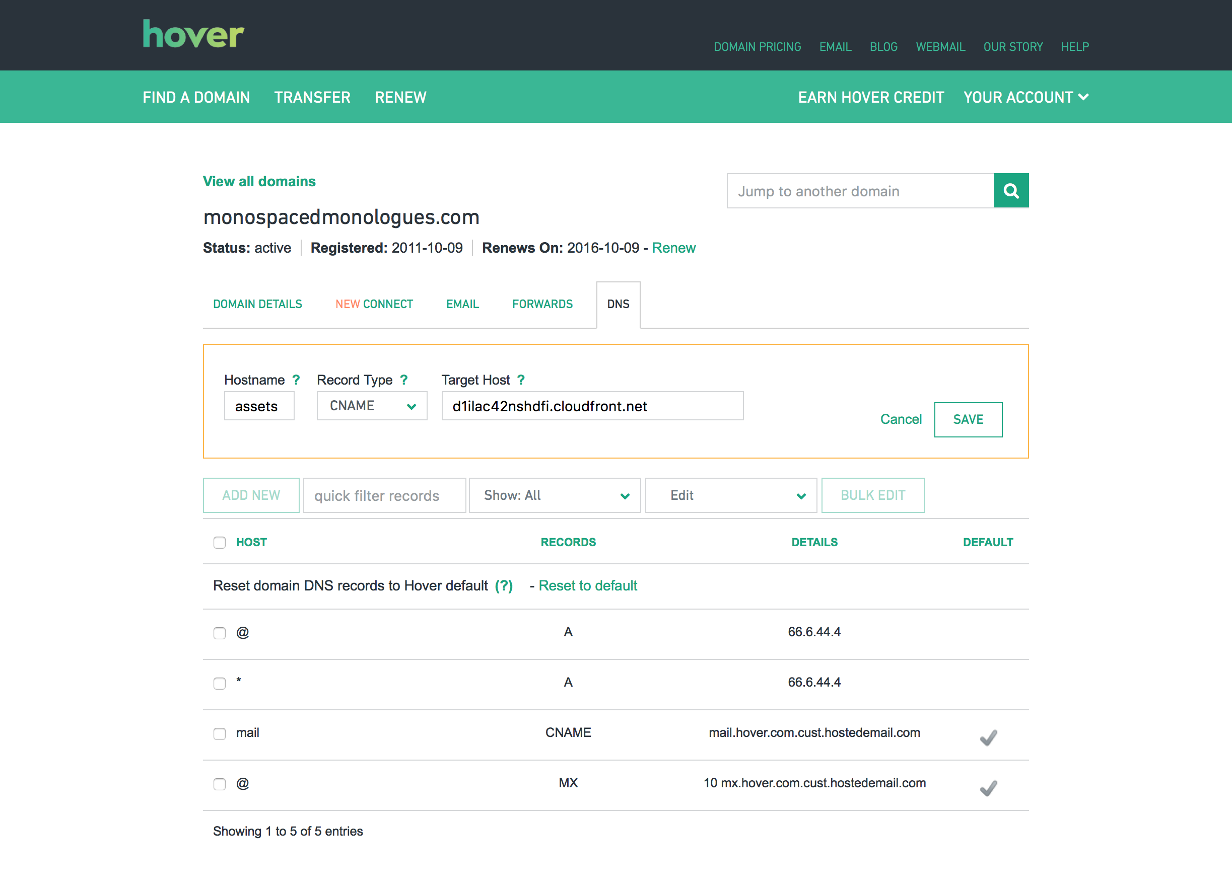 Finally, you'll need to add a DNS record. I use Hover, but your domain provider will be very similar. Simply add a CNAME record with the subdomain name, and provide your distribution domain as the target. In my case, the source hostname is "assets" and the target is "d1ilac42nshdfi.cloudfront.net".