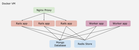 The diagram below shows the architecture of the example. Basically we run one container for the Mongo database, one for the redis store and multiple containers for the Rails application and the Workers (Sidekiq). On top of that is the Nginx load balancer container that acts as a reverse proxy for the rails containers.