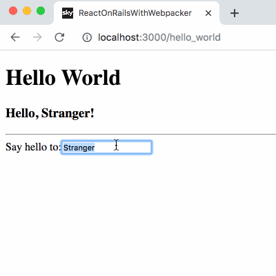 <%= react_component("Hello", { name: "react-rails" }) %>Now if you restart the Rails server, you can see the gem in action in your browser at http://localhost:3000: