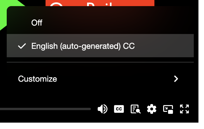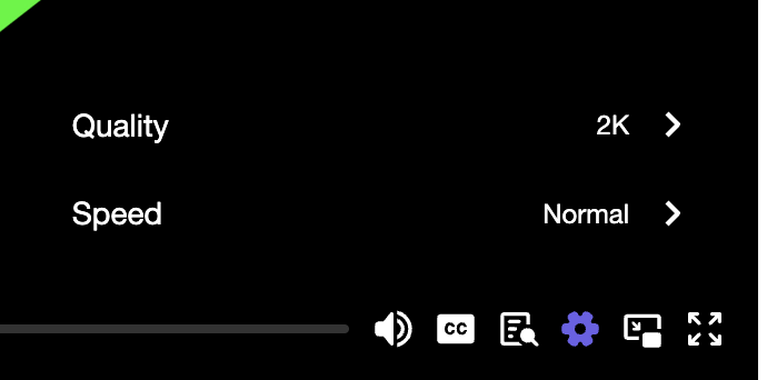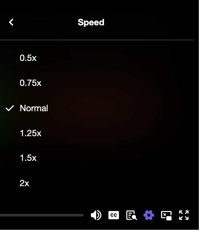 You can turn on closed captions / subtitles, adjust the speed (slower or faster), search a full text transcript and change the video quality (from 240p all the way up to 4K). Click the button labelled CC to open the menu for turning on/off closed captions (subtitles). Click the gear iconto open the menu for controlling video quality and speed.