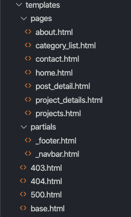 To implement this, we're creating a partial directory inside our templates directory and separating our navbar and footer. The templates directory now looks like this: